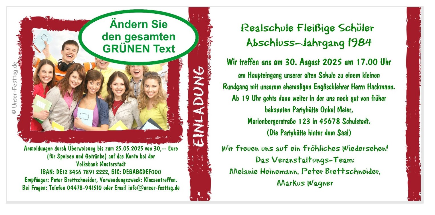 Lustige und originelle Einladungskarte für Ihr Klassentreffen mit Ihrem Wunschtext und Foto. Der Text, der von